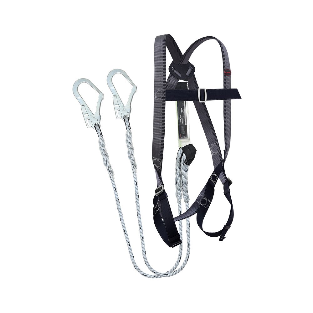 - Includes forked lanyard with integrated energy absorber to reduce fall impact.
