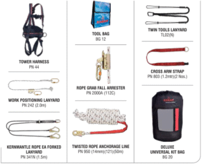 This kit is designed for the personnel engaged in working on a high rise tower with an extra provision of bigger hooks and easily adjustable lanyards to suit the requirement of the working individual.